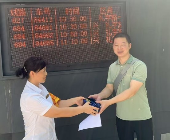 另一边,一名热心乘客在座位上捡到钱包并交给了驾驶员杨刚代为寻找失主。当车辆返回场站时,驾驶员杨刚及时把钱包交给调度朱德琴,并将钱包进行妥善保管及登记。