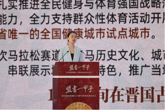 发布会现场,中共临汾市委宣传部部长、一级巡视员闫建国、中共侯马市委书记吴勇致辞;侯马市人民政府副市长李晶晶发布四大主题活动:侯马盟书文化学术交流活动、首届“侯马盟书”书法篆刻展、“盟誓侯马”半程马拉松以及侯马盟书主题微短剧创作,并向大家介绍了举办系列活动蕴含的时代意义及创新亮点。