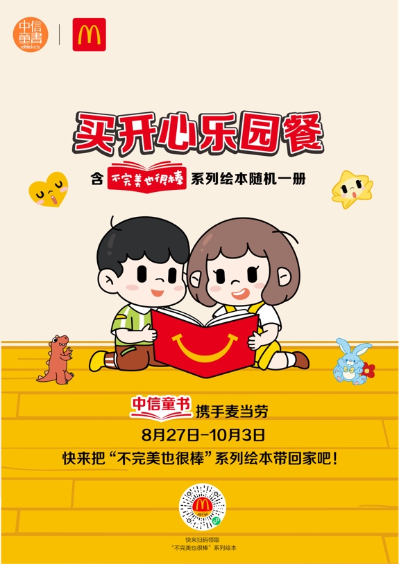 自8月27日至10月3日,凡在麦当劳全国门店购买一份开心乐园套餐,即可免费获赠由中信童书联合麦当劳中国精心打造的“不完美也很棒”系列儿童心理绘本一册。此次合作也是中信童书联合麦当劳中国赋能儿童阅读多元场景的重要实践,双方希望通过将阅读融入餐饮场景,在让知识与快乐伴随孩子成长的同时,重构多元阅读新方式。