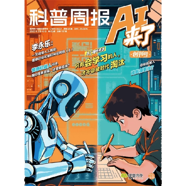 《科普周报》“AI来了”是一本专为8至15岁青少年打造的人工智能素养读物。它以“塑思维、强实践、启职业、创未来”为核心目标,围绕“5项能力”与“6种思维”基础框架,培养青少年逻辑推理、跨界创新等关键素养。期刊设置了多个层次丰富、结构清晰的栏目,既有对全球AI发展的动态观察,也有面向学习场景的知识实践,力求让内容既权威严谨,又贴近青少年的兴趣与需要。