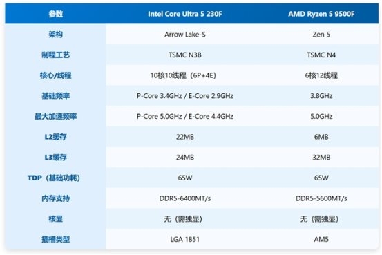 AMD锐龙5 9500F与英特尔酷睿Ultra 5 230F是当下1000元档位具有代表性的CPU之一,同时也体现了英特尔与AMD两家设计上的方向。