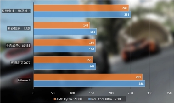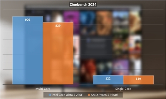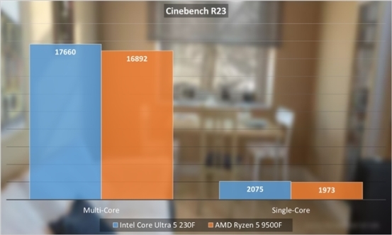 在实际测试中,酷睿Ultra 5 230F表现要比锐龙5 9500F更强一些。