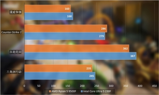 在《Counter-Strike 2》中,锐龙5 9500F则是扳回一局,比酷睿Ultra 5 230F表现好大概3%。