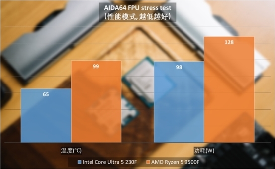 这里我们对两块处理器均接上360水冷,利用AIDA64 FPU压力测试对酷睿Ultra 5 230F与锐龙5 9500F施加压力。酷睿Ultra 5 230F的CPU封装功耗为98W左右,核心温度65℃左右。同样的条件下,锐龙5 9500F则有128W,核心温度99℃,已经开始撞到温度墙。