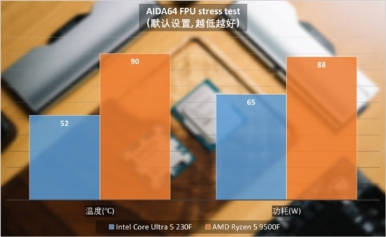 值得关注的是,如果仅以默认模式运行,例如酷睿Ultra 5 230F与锐龙5 9500F60W使用默认的功耗,两款处理器功耗分别为65W和88W,温度52℃和90℃。