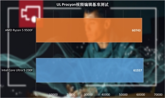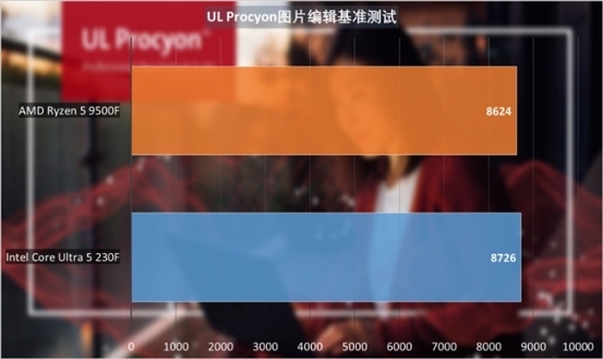 UL Procyon图片编辑基准测试中,酷睿Ultra 5 230F表现要比锐龙5 9500F也要强1%左右。