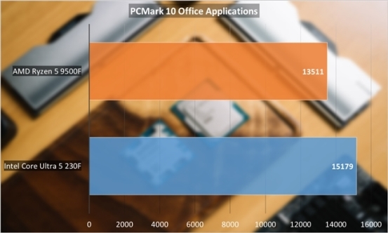 PCMark 10 Office Application测试的是Word、Excel、PowerPoint以及浏览器连续打开、编辑、多任务切换工作,比较考验单核burst性能和多线程并行效率表现,这里酷睿Ultra 5 230F优势较为明显,相对锐龙5 9500F有超过10%的性能表现。