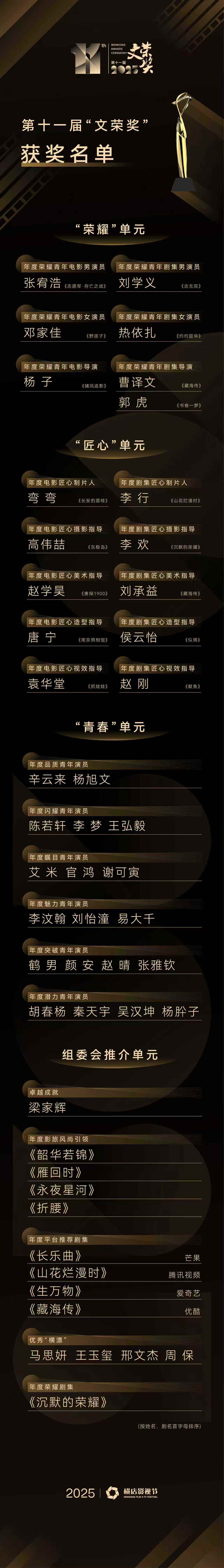 今年的“文荣奖”在奖项设置上更加完善,以扶持影视新生力量为宗旨,共同发掘影视行业的新锐力量,延续了对青年影视人的关注,设置“荣耀”“匠心”两大竞赛单元及“青春”“组委会”两大推介单元。