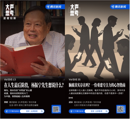 带着这样的想法,腾讯新闻在2025年11月上线了一档全新专栏「大声思考」,汇聚“思考者”们,提炼具有解释力与启发性的观念或观点,并以专业而不失可读性的方式传递出来,让思考被看见、被讨论、被记住、被启发。