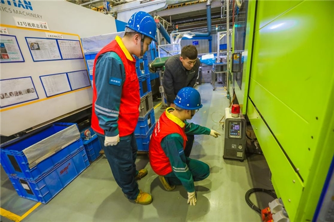 国网香河县供电公司党员服务队队员在赛铭瑞汽车配件厂检查用电设备。(王爱华 摄)