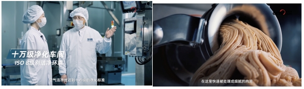 跟随镜头进入鲜朗的十万级净化车间,这里温度严格管控,当日送达的鲜肉在这里被迅速处理为细腻肉泥。整个流程对温度与时间的把控近乎苛刻,只为最大程度保留原料的新鲜与稳定。