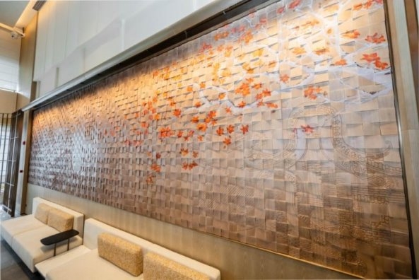 酒店大堂背景墙以雕版印刷为灵感,通过书籍、纸雕、木块的有序排序与艺术重组勾勒出雕版印刷的凹凸肌理,并将木棉花色与岭南建筑意象巧妙融于其中,以北京路“城央书坊”的文艺底蕴,刻画出古代中轴线起止点以及现代城市中轴天际线的街景,将北京路书坊产业传奇与广州古、现代中轴线的千年变迁娓娓道来,每一处肌理都藏着城市的记忆与温度。