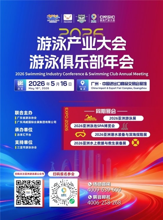 以赛事为良好开端,广东省游泳协会与广东鸿威国际会展集团将进一步深化产业协同,共同打造行业标杆级会展平台。2026年5月15-17日,由广东省游泳协会支持,广东鸿威国际会展集团主办的2026亚洲游泳展将在广州·中国商品交易会展馆启幕。展会同期将举行2026年游泳产业大会暨游泳俱乐部年会,大会以“安全筑基·科技赋能·盈利破局”为主题,聚焦行业政策解读、水质安全管控、智慧场馆建设、俱乐部运营增收、游泳教学体系建设等核心议题。届时,全国各省市游泳协会代表、行业专家、场馆投资人、俱乐部创始人及产业链上下游企业将齐聚一堂,共同打造集展示、交流、对接、合作于一体的行业年度盛会。