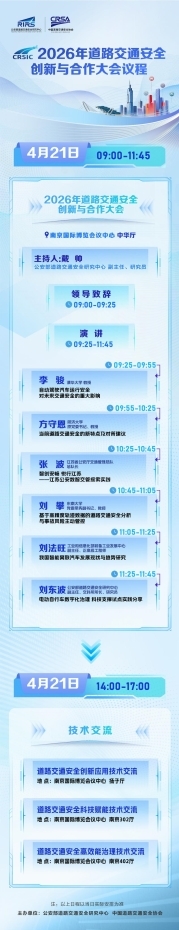 经公安部批准,由公安部道路交通安全研究中心与中国道路交通安全协会共同主办的2026年道路交通安全创新与合作大会(以下简称大会),将于2026年4月21日在南京国际博览会议中心举办。大会以“慧聚金陵 路畅行安”为主题,邀请国内外道路交通安全领域权威专家、知名学者、行业精英及公安交管一线骨干代表参会,聚焦自动驾驶运行安全体系构建、道路交通安全新特征与对策、数智化交管创新实践等议题开展深入交流与成果分享,集中探讨交通安全领域前沿理论、核心技术与交管成效,不断凝聚全社会交通安全共治合力,推动构建科学化、精细化、智能化的现代道路交通安全治理体系,为保障人民群众出行安全、维护社会大局稳定、服务经济社会高质量发展提供坚实支撑。